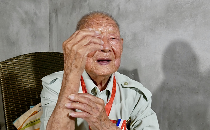 第二次与日军的激战,成了他永生难忘的一役。一千七八百名日军猛攻垭口,他与另外两挺机枪扼守阵地,敌人近在百余公尺。“从头天下午四点打到第二天早上!”他比划着扫射的动作:“我是班长,我不打,后面的兵就不会打。根本没想过怕,也没想过死,就想着用机枪扫倒一片又一片的鬼子。”激战中,他目睹部下普向林被炮弹炸断双腿:“连句话都没留下……”说到此处,老人陷入沉默。