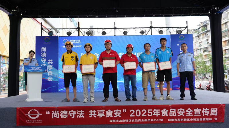 随后,精彩的非遗金钱板+食品安全科普节目《在成都安“驿”吃》闪亮登场,表演者以独特的金钱板节奏,巧妙地将食品安全知识融入唱词,生动活泼的表演形式引得现场观众笑声不断,在欢声笑语中,大家对食品安全知识有了更深刻的理解。在众人的期待中,食品安全征集标语揭秘环节将活动推向高潮。“食安筑防线、烟火暖龙泉”“龙泉食安桃花源、舌尖幸福共护圆”等一条条充满乡土情的标语呈现在大家眼前。这些凝聚着群众智慧的标语,不仅展示了市民对于食品安全的关注,更传递出对食品安全的美好期许,标语入围者陶先生表示,食品安全不是哪一方的事,希望大家共同参与食品安全监督。紧接着,食品安全监督员聘书颁发仪式庄重举行,外卖员代表们接过聘书,他们将肩负起新的责任,成为食品安全监督的重要力量。“网络餐饮明厨亮灶”项目启动仪式也同步开展,这一创新举措将进一步提升网络餐饮的透明度,让市民吃得更放心。