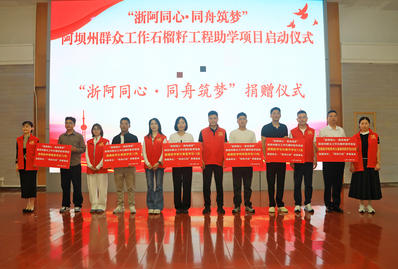 8月20日,“浙阿同心·同舟筑梦”阿坝州群众工作石榴籽工程助学项目启动仪式在阿坝职业学院举行。浙江省温州市“同舟行动”慈善基金、公益组织及社会爱心人士共同向阿坝州150名学生捐赠助学金和学习用品。