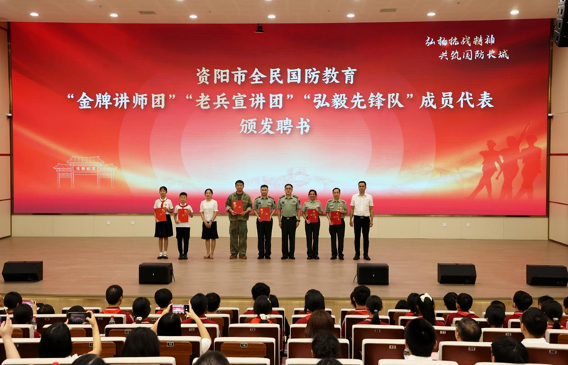 现场还为“金牌讲师团”“老兵宣讲团”“弘毅先锋队”颁发聘书,这支由专业讲师、退役老兵、青年骨干组成的队伍,将成为资阳国防教育的“移动课堂”;“爱我国防”文创大赛100件优秀作品同步亮相,从宣传文案到数媒创意,展现了国防情怀的时代表达;“大兵小将筑国防”活动获奖者登台领奖,“小手拉大手”的教育模式,生动诠释了“教育一个孩子、带动一个家庭、影响整个社会”的国防教育理念。