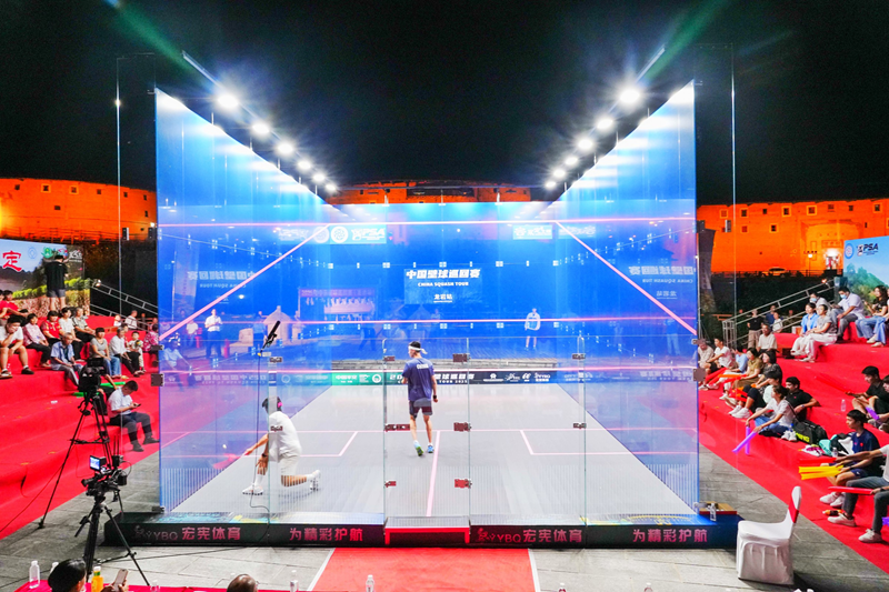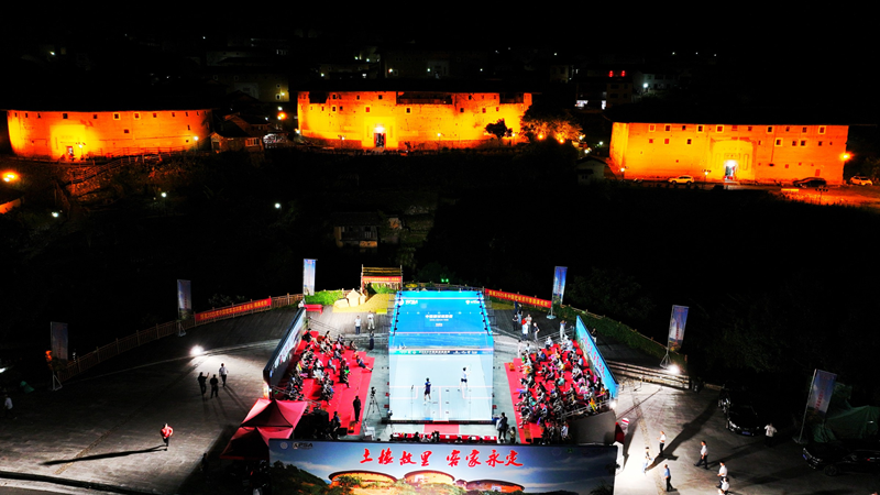 初溪土楼群始建于明代,历经数百年风雨仍保存完好,其独特的天然环形结构不仅造就了完美的声学效果,更在本次赛事中为观众带来了独一无二的沉浸式观赛体验。当来自中韩两国的壁球选手在土楼前展开激烈角逐时,快速的击球声与土楼厚重的历史气息相互交织,形成了一幅极具冲击力的画面——选手们灵活的走位、精准的击球与土楼沧桑的墙体相映成趣,既展现了竞技体育的活力激情,又凸显了文化遗产的恒久魅力。选手们精湛的球技和顽强的拼搏精神赢得了观众的阵阵掌声。