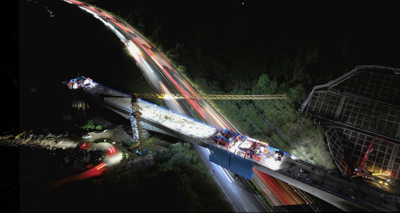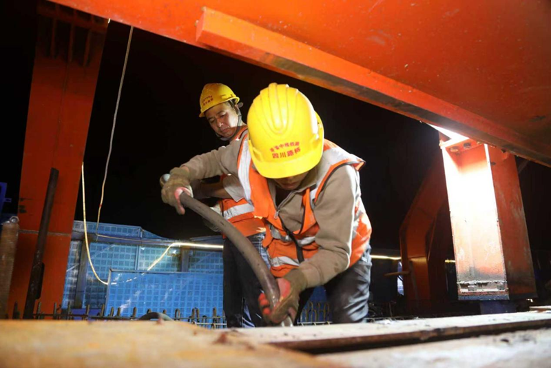 强光穿透夜幕,照亮了跨渝蓉高速特大桥的合龙作业面。四川路桥的建设者们头戴安全帽,在全封闭造桥机内,精细地进行着(72+128+72)米连续梁中跨的最后混凝土浇筑。