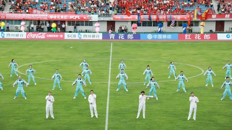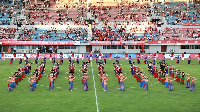 演出中,演员们还变换队形,拼出“PZH”(攀枝花)与“CCJY”(川超加油)字样,为赛场的球队加油助威,营造出激情四射的视听氛围,赢得球迷们喝彩呼应,点燃赛场气氛。