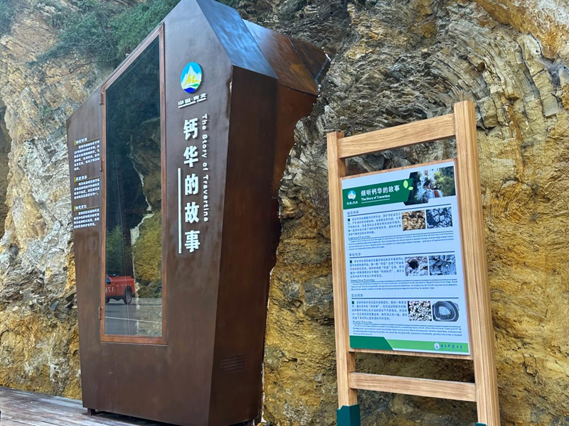 科普墙核心展区创新采用“钢化玻璃遮罩+局部剖面切割”设计,将层状钙华的精妙内部结构完整、清晰地呈现在游客眼前。同时,合作双方依托专业技术开展科学测年分析,清晰界定地质年代背景,帮助游客直观理解钙华地貌“亿万年形成”的漫长过程与自然演化规律。展区配套设置的静态讲解展板,以图文并茂形式重点科普纹层钙华、年轮钙华、豆状钙华的典型形态特征及形成条件,为游客提供系统、准确的地质科学知识,进一步丰富科普内容维度,满足不同游客的知识获取需求。
