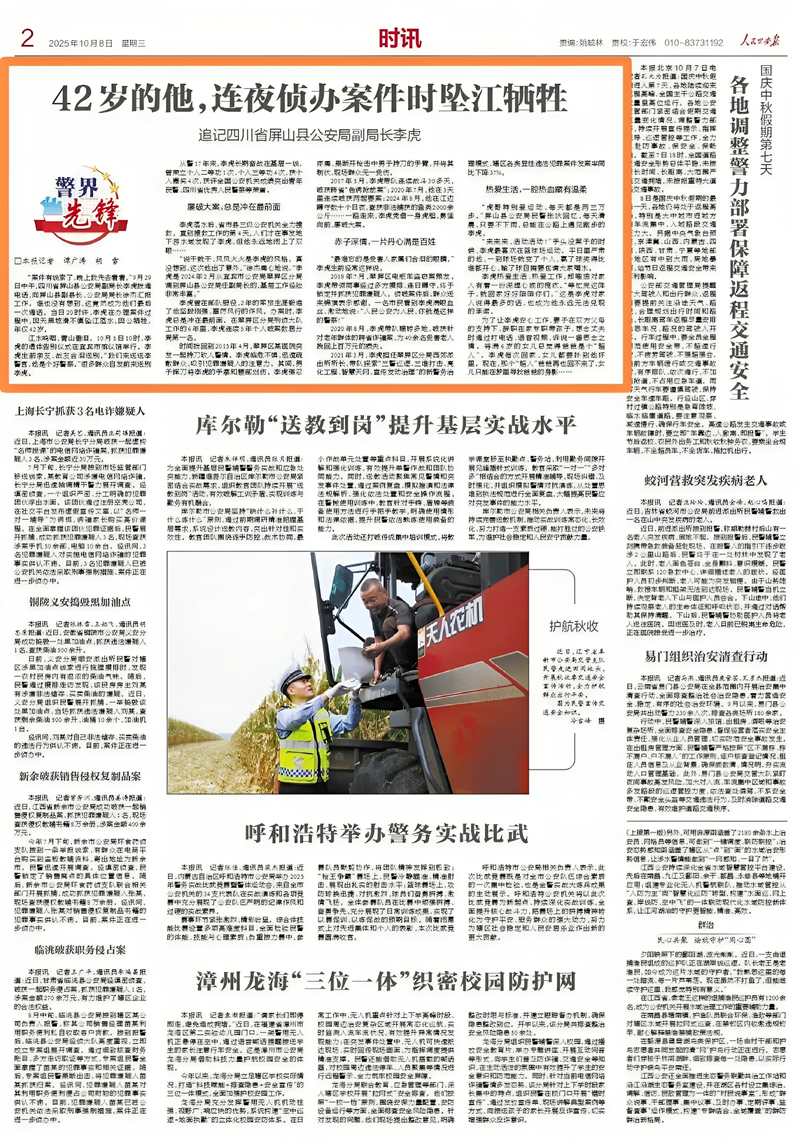 10月8日,《人民公安报》“时讯”版以题为《42岁的他,连夜侦办案件时坠江牺牲》,对屏山县公安局副局长李虎连夜侦办案件时坠江牺牲进行了详细报道。