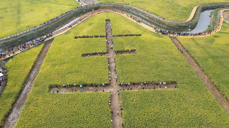 群众为庆祝丰收在稻田中收割出的巨大“丰”字图案