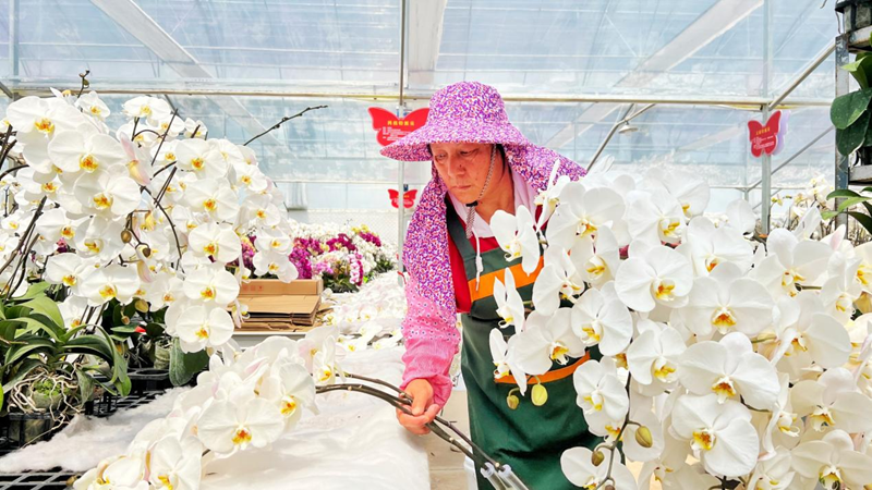 初冬时节,永定区龙潭镇枫林村蝴蝶兰大棚内,一株株白色蝴蝶兰如蝶翼般舒展,花瓣莹白透亮,似要乘风飞去。工人们手指翻飞,熟练地将开得正盛的鲜花剪下,理齐花茎、套上保鲜膜,再小心翼翼装车发往全国各地。