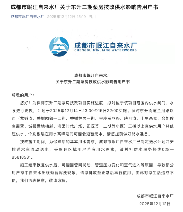 14日晚,该技改项目核心供水阀门与水泵更换工作按计划有序开展。作业过程中,岷江水厂紧密配合改造单位启闭管网阀门为施工创造作业条件。此外,为最大限度降低改造期间对片区用水的影响,岷江水厂提前制定了保供方案,多渠道发布用水信息,线上通过微信、短信发布用水公告,明确低压供水时段及影响范围,线下联动街道、社区和物业,让用户提前做好储水准备,共推送短信16623户。改造期间,岷江水厂还配合改造单位安排送水车开展流动送水服务,重点保障低压供水区域居民的用水需求;24小时供水服务热线保持畅通,确保第一时间响应和解决用户反映的用水问题,全方位守护改造期间的用水安全,累计解答用户咨询近200人次。