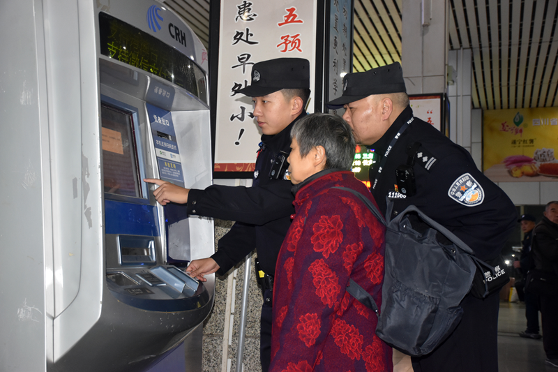 服务旅客始终是铁路公安工作中最温情注脚。12月22日上午11时,一位老人在遂宁站候车大厅内徘徊张望,民警张浩军、徐伟高铎主动上前询问,原来老人不熟悉购票流程,找不到所乘车次检票口和座位号,2名民警主动引导老人来到自助服务机旁边,耐心帮助老人查询打印行程信息,并一步步指导完成操作。“多亏你们帮忙,不然我真不知道怎么办!”老人连声道谢。