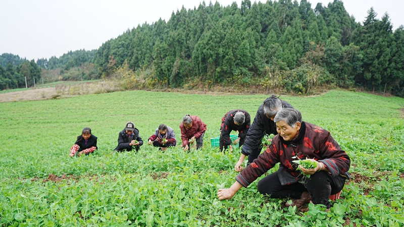 虽是冬日,四川省安岳县卧佛镇卧佛村的田野却不见萧瑟。12月23日,来到连片的豌豆尖种植区内,村民们正穿梭田间,手指轻巧地摘下豌豆植株顶端最嫩的“一叶一心”。“我们只采这最嫩的部分,它是进入北京、上海等地商超的‘金钥匙’!”驻村第一书记杨伟捧着刚采摘的豌豆尖介绍道。