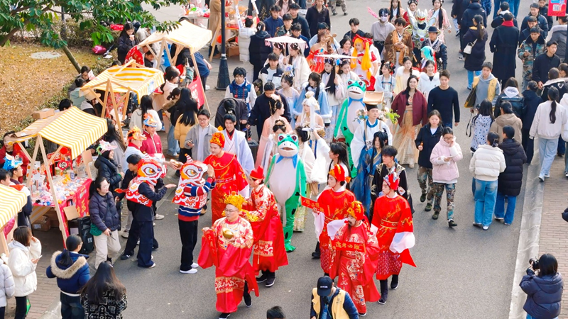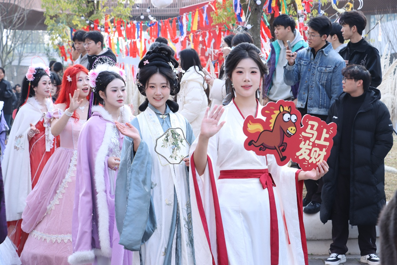 家乡美食、手工原创、新年打卡、原创设计等丰富品类目不暇接,各摊位“主理人”各展其能,或热情叫卖,或装扮成特色角色与师生互动,吆喝声、笑声、音乐声此起彼伏,尽显青春活力与创意。