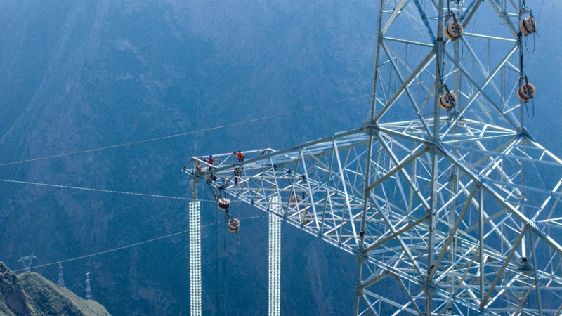 现场,一座座崭新的铁塔巍然耸立。电力工人们系着双保险安全绳,站在铁塔上,在寒风中进行附件安装作业。他们脚下,一条条银色导线在设备牵引下缓缓升起,横跨河谷、翻越山脊,将铁塔相连,勾勒出绿色清洁的能源动脉。