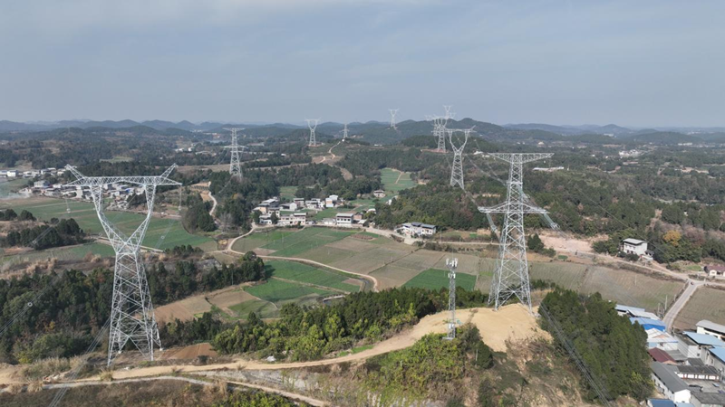 2025年12月25日,在德阳市中江县,已完成部分导线展放的阿坝—成都东1000千伏特高压交流输电工程15标段(国网四川建设公司供图)