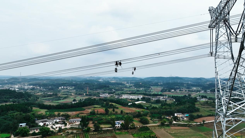 2025年12月25日,在德阳市中江县,阿坝—成都东1000千伏特高压交流输电工程15标导线展放作业现场,国网四川电力工人正在安装间隔棒(国网四川建设公司供图)