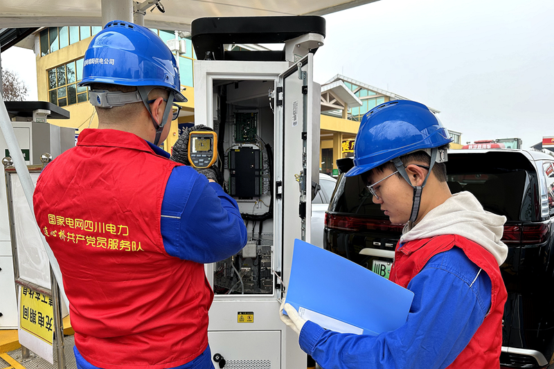 在京昆高速绵广段新安服务区,国家电网四川电力(绵阳)连心桥共产党员服务队细致检查充电设施运行状态,并向过往旅客宣传安全用电知识,助力游客出行无忧。(刘一琅摄)
