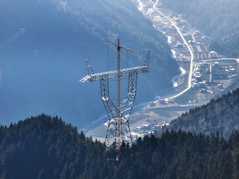 在阿坝州理县米亚罗镇,阿坝—成都东1000千伏特高压交流输电工程1标段正通过双平臂抱杆方式开展组立工作。(尤琅摄)
