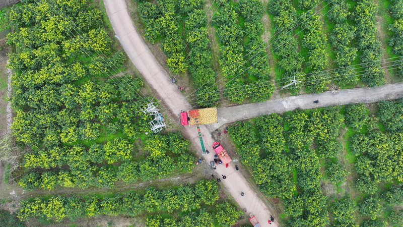 柠檬园内,一辆运输车正在装货。闫凯 /摄