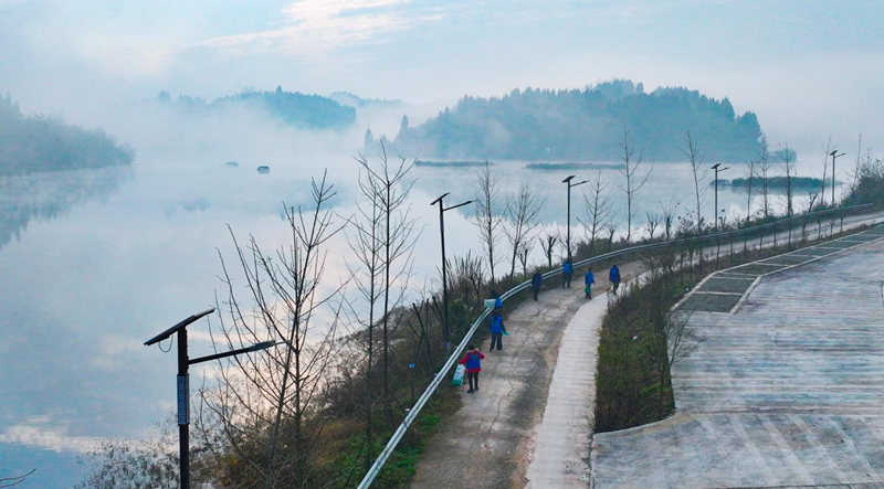 1月8日,在四川省资阳市乐至县蟠龙镇黑堰塘村的蟠龙湖边,晨雾萦波,湖水静谧,巡河员张茹兰的脚步声划破了这片宁静。她举起手机对水面“咔嚓”一声,一张照片传至“蟠龙湖管护”微信群。不远处,村党总支书记胡容正俯身查验护坡,笔尖在巡护本上沙沙作响。身后,队员修剪杂草的声音清脆地落进晨光里。