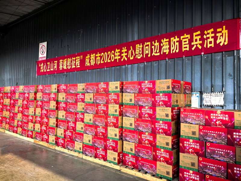 1月22日上午,冬日照耀在蓉城的一处物流园区内,成都市及邛崃市、金堂县等3个“全国双拥模范城(县)”精心准备的600个印着“双拥”标识的纸箱整齐码放,箱体上两句标语格外醒目——“难得举城作一庆,爱我人民爱我军”“向戍守边防的人民子弟兵学习致敬!”空气中,隐隐弥漫着糖果糕点的甜香与墨汁的清香。这不是普通的货品出库,而是一场跨越山海的心意集结。