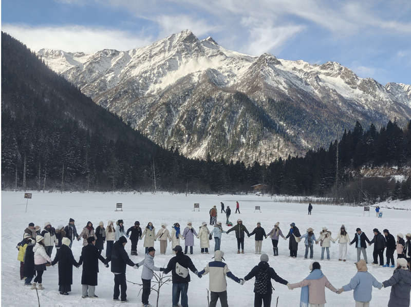 达古湖的冰面凝着厚雪,莹白平整,成为游客嬉戏的乐园。大家相携在冰面打闹,踩出串串错落脚印,爽朗的笑声打破湖面静谧。风卷细碎雪粒随欢声笑语漫扬,冰面倒映着游人笑颜与天边流云,尽显高原冬日独有的热闹与温柔。